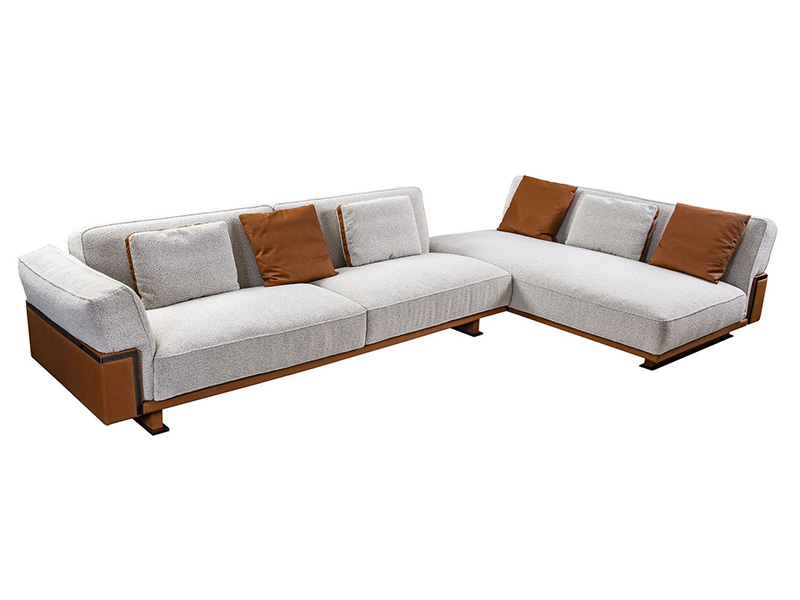 进口头层黄牛皮(B级FM系列/西皮配皮)/布艺:(XX1系列棉麻布)/磨砂布(L698系列)+高密度回弹海绵+实木内架+不锈钢拉丝脚+饰边条+鹅绒填充