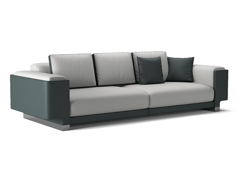 进口头层黄牛皮(B级BC系列/西皮配皮)/布艺:(XX1系列棉麻布)/磨砂布(迈凯伦系列)+高密度回弹海绵+实木内架+不锈钢黑钛脚+鹅绒填充靠包