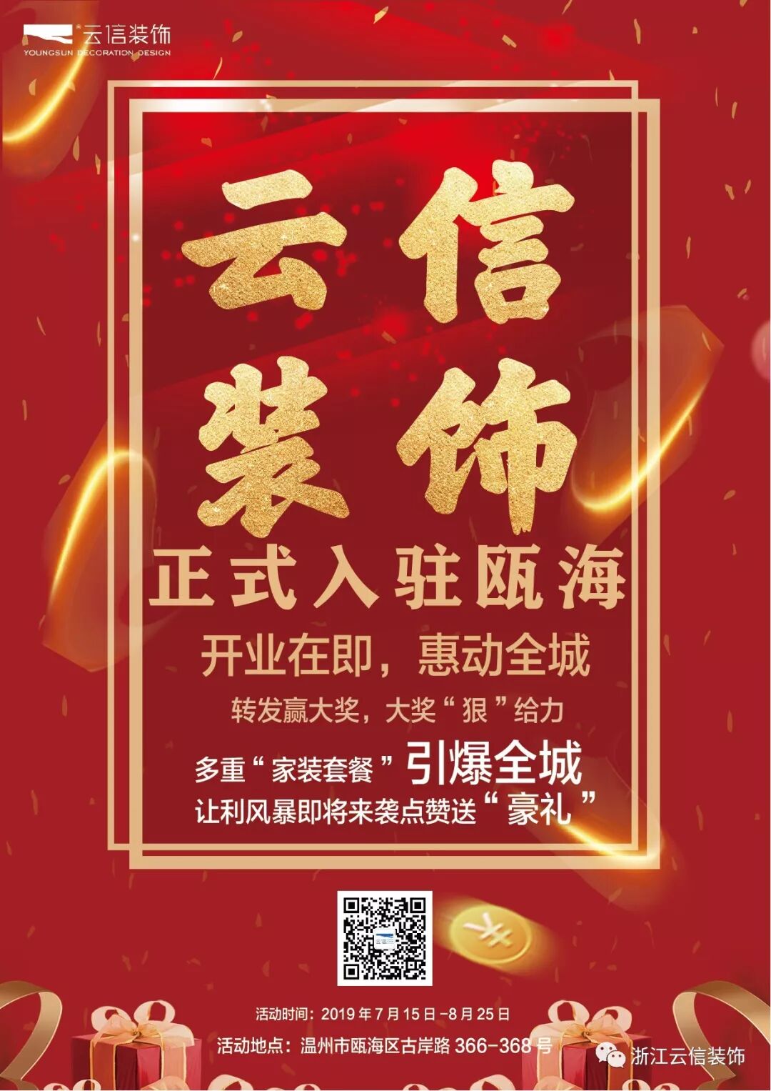 正式入驻瓯海 转发赢大奖,大奖“狠”给力 云 信 浙江云信装饰工程有限公司创建于2005年,目前已发展为室内设计、施工、管理等一体化的团队。 14年来,云信一直于“绿色、多元、创新”的理念打造全方位的无忧装饰工程,将独具特色家装进行到底! 通过吸纳、整合国际环保理念和技术标准,结合自身十余年家装行业的经验积累与沉淀,通过持续研发和提升工程管理,严格保障每一项工程的品质。在坚守品质不变的同时,公司秉持“与时俱进,开拓创新”的发展思路,将科技、智能、互联网思维融入家装! 未来,公司将持续推动企业向一体化、品牌化、集团化发展。 现感恩回馈广大新老客户, 多重“家装套餐”引爆全城, 更有“壕礼”等着你! 云信装饰强势入驻瓯海地区, 将云信装饰工艺和专业家装实力带入瓯海, 一步一个脚印,稳步前行, 给瓯海业主带来更好的家装体验! 7月15日-8月25日 重磅出击 疯抢开始 让利风暴即将来袭 进门礼 瓯海分公司开业当天 上门客户即可领取精美茶具套装一份 先到先得,领完为止。 集赞第一波(7.15-08.01) 转发图片并配文“给我点赞了,要58个,助我免费看电影。大家动动手指好消息和大家一起分享!云信装饰强势入驻瓯海,瓯海区古岸路366-368号,多重“家装套装”引爆全城!让利风暴即将来~~~袭!”至朋友圈,不设分组, 累积点赞58个,免费领取电影票一张(电影票于白鹿影城、新中国影都、新时代电影大世界、大众电影院四家影城均可用,任何场次可兑), 先到先得,领完为止。 ( ( 集赞第二波(未完![]()